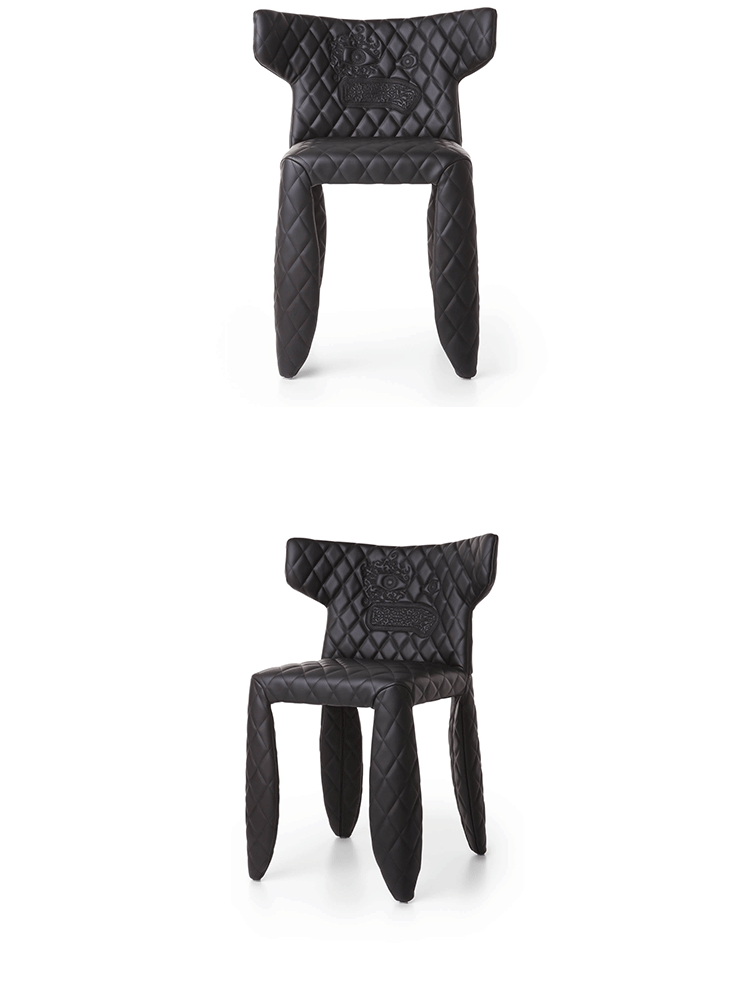 "A soft,puffy and stylish chair with an optional monster face embroidered on the backrest.The monster is a symbol of the eternal battle between opposite forces that take place in life and can be easily recognized inside ourselves,if we have the courage to open our eyes.Scary? Not at all!You forget about the monster once you sit down and enjoy the chair's comfort and softness.Marcel Wanders grew up in Boxtel,the Netherlands and graduated cum laude from the School of the Arts Arnhem in 1988.His fame started with the iconic Knotted Chair in 1996.He is now designing for the biggest European contemporary design manufacturers including Moooi of which he is also art director and co-owner.He works on architectural,interior design and consumer home appliances.His designs have been selected for the most important design collections and exhibitions around the world.Monster chair is offered with a synthetic leather upholstery in black.The chairs can be ordered with or without monster face and with or without armrests. The monster embroidery is identical in both versions."