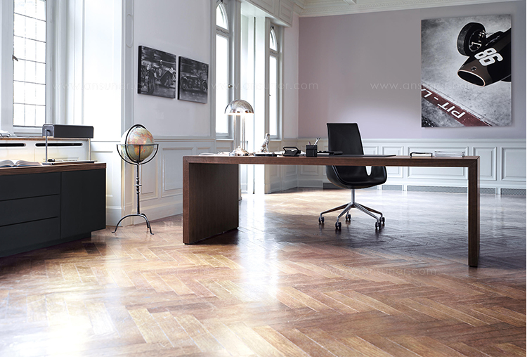 桌面和侧面,水平和垂直形成一个均匀的结构,是Headoffice Mono系列会议项目设计团队所执行的结构概念。强大的线条与精选材料的优雅相结合。由侧面和桌面所制成的直角,中间的桌子上有醒目皮革包裹的面板,如果有需要,可以使用滑动皮板来打开集成线路。电缆布线隐藏在桌面和副柜之间。