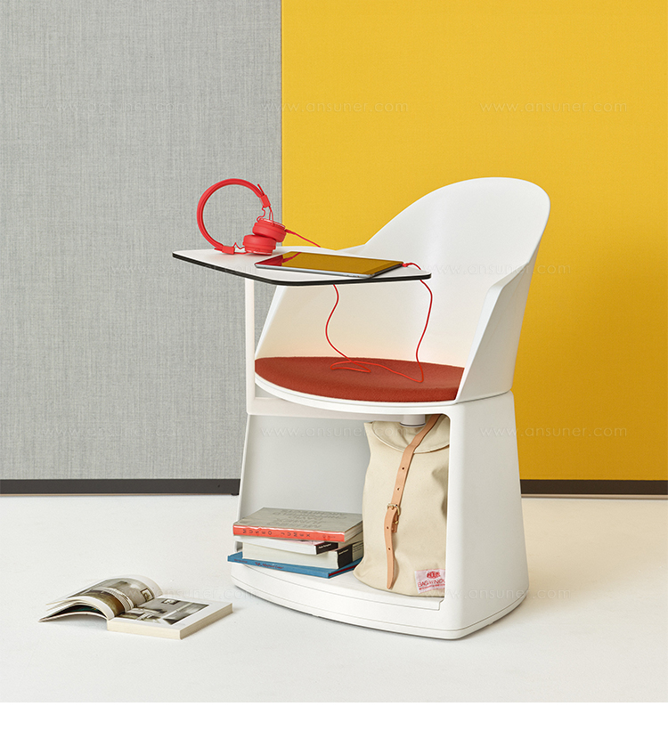 Cila Go底座与带有或不带扶手的Cila椅子外壳相结合,成为专为学习领域设计的灵活工作站。底座上的轮子可以轻松地在教室中形成灵活的座椅配置 - 从行或圆形的大型组安排,小组吊舱学习或个人空间。带摆臂的桌面可容纳笔记本电脑,平板电脑,书籍或笔记本电脑;尺寸为50x33,5厘米,有黑色或白色可供选择。