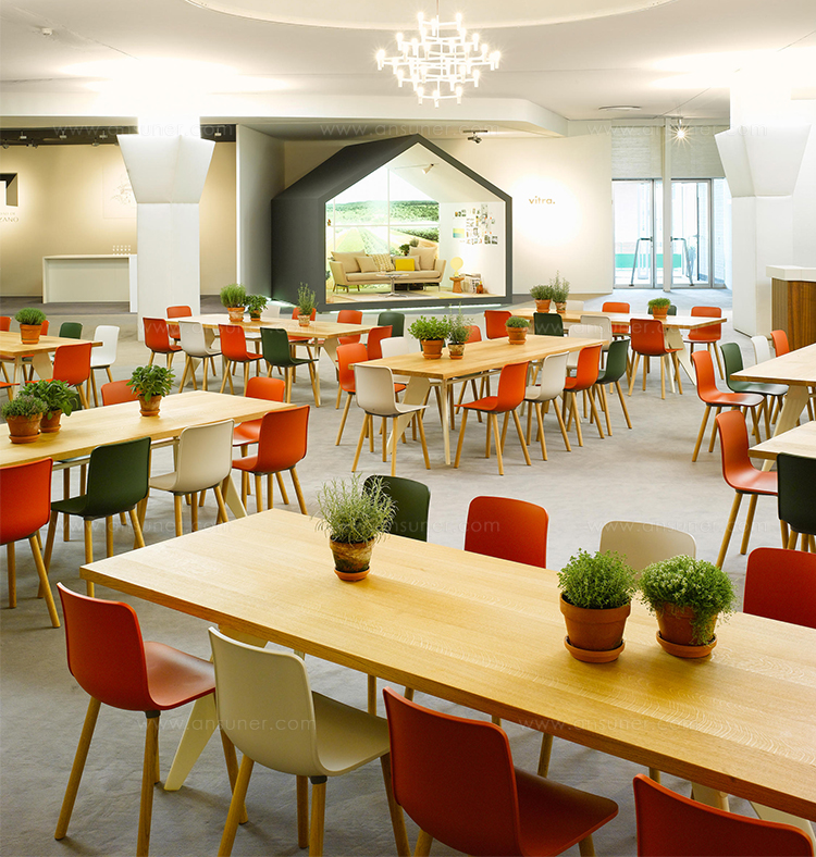 JeanProuvé的EM Table的美学外观坚持结构原则,说明其结构中的力和应力流动。 它有各种尺寸,桌面采用优质实木或HPL层压板,颜色可供选择。 长度为2000或2400毫米的顶部也有橡木贴面。 由于这种广泛的选择,每个餐厅都可以找到理想的EM Table。