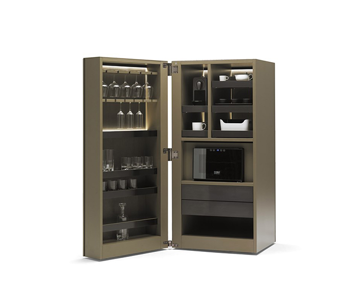 顶部,侧面门,背微膨体漆面内饰早在木材表面。在技术,皮革软垫盘彩色不锈钢。上层建筑货架和抽屉的阵地。在铰链黑镍。
