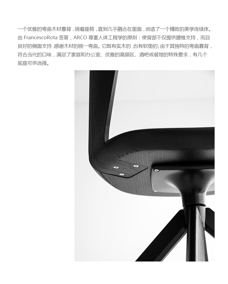 从一开始,Lapalma就以舒适、多功能性和清醒优雅为特征。这些也是新的折中椅的优点。它的主要特征是一个优雅的弯曲木材靠背,它绕着座椅,直到它几乎消失在里面,创造了一个精致的美学连续体。由FrancescoRota签署,ARCO尊重人体工程学的原则:它欢迎您的背部不仅提供腰椎支持,而且良好的侧面支持,感谢木材的统一弯曲。它既有实木的,也有软垫的;由于其独特的弯曲靠背,符合当代的口味,满足了家庭和办公室、优雅的高频区、酒吧或餐馆的特殊要求,有几个底座可供选择。