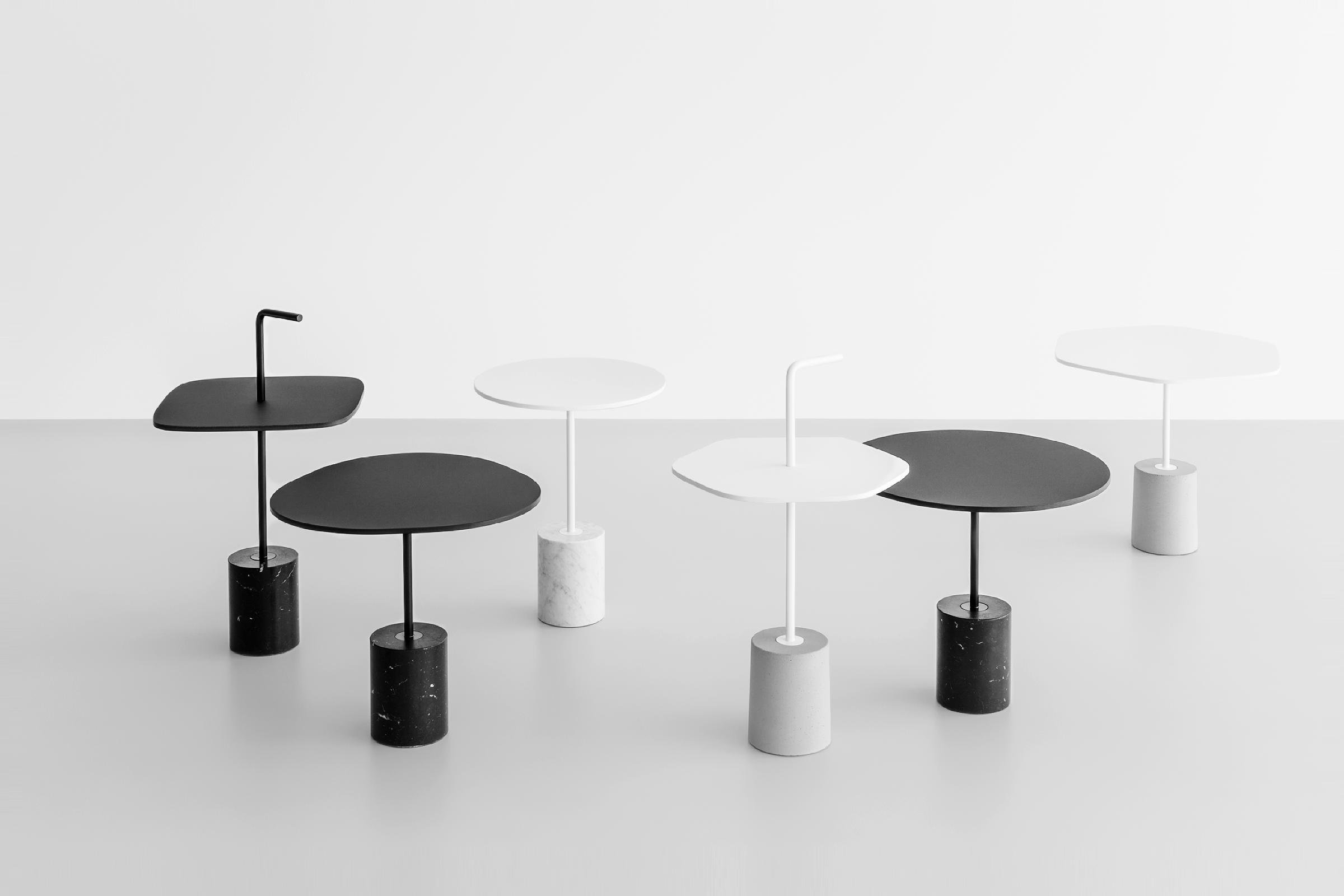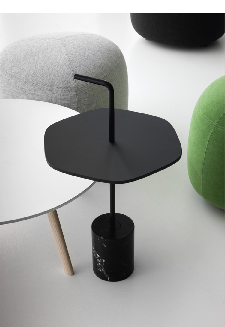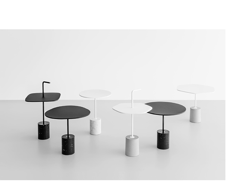 JEY.稳定且可移动。它可以作为一个顶部或便携式的桌子。它有两种不同的高度(45和50厘米)和四种不同的顶部,两种材料和两种颜色。它是一种小型的桌子雕塑,有大理石或水泥底座,管状柱以各种几何图形发展成一个形状的顶部,以一个手柄结束。手柄形状的弯管可以方便地移动桌子,特别是在高频区域(如办公室、酒店、酒吧、餐馆等),但也适用于当代居住环境。它可以与扶手椅、沙发、另一张桌子或另一张Jey相匹配。