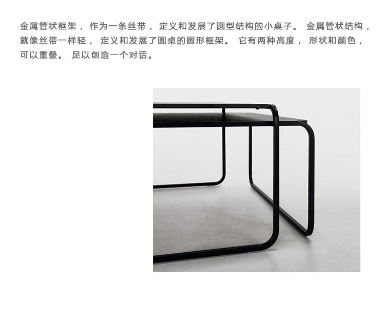 金属管状框架,作为一条丝带,定义和发展了圆型结构的小桌子。因此,金属管状结构,就像丝带一样轻,定义和发展了圆桌的圆形框架。它有两种高度,形状和颜色可以重叠。足以创造一个对话。