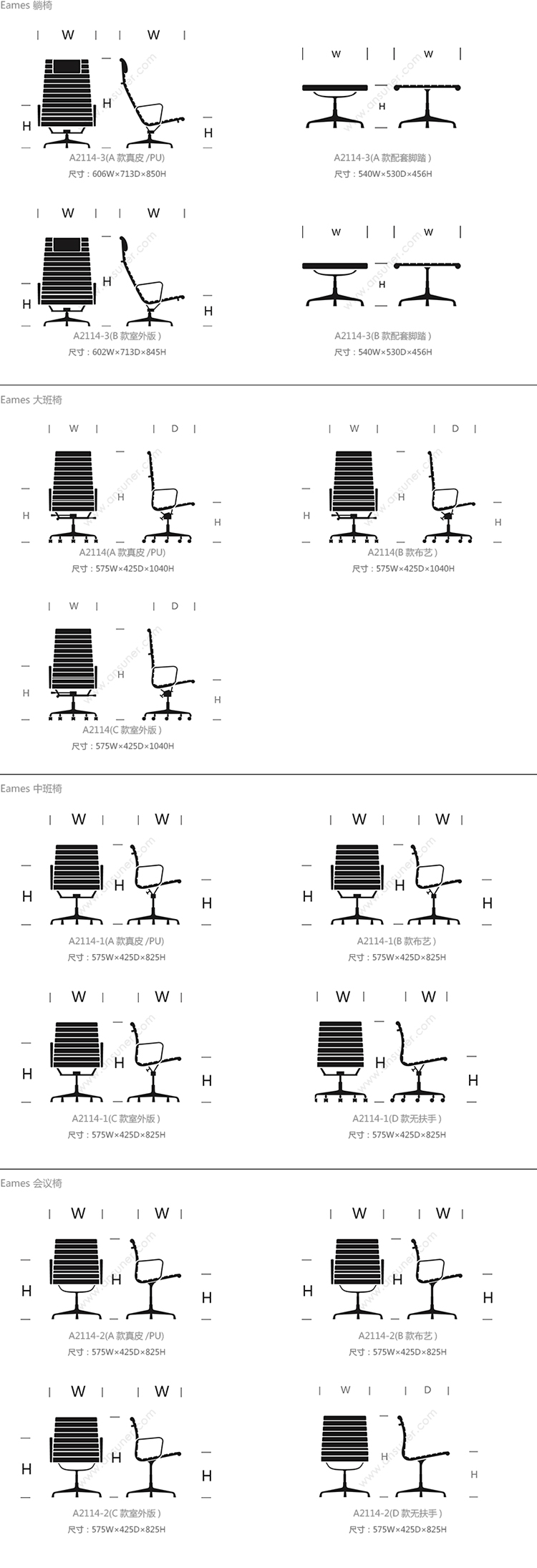 Eames 躺椅 系列尺寸/示意图