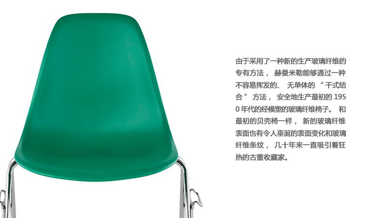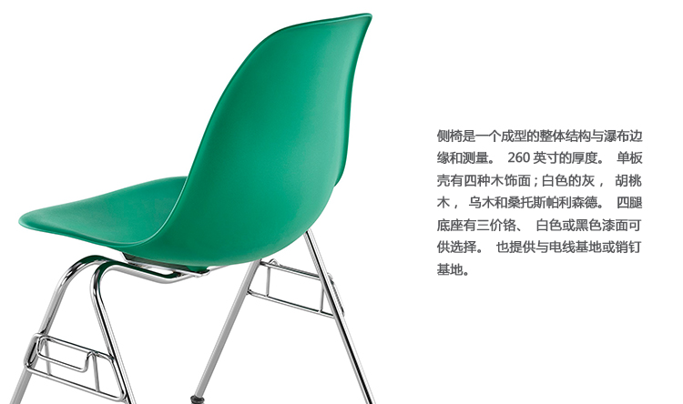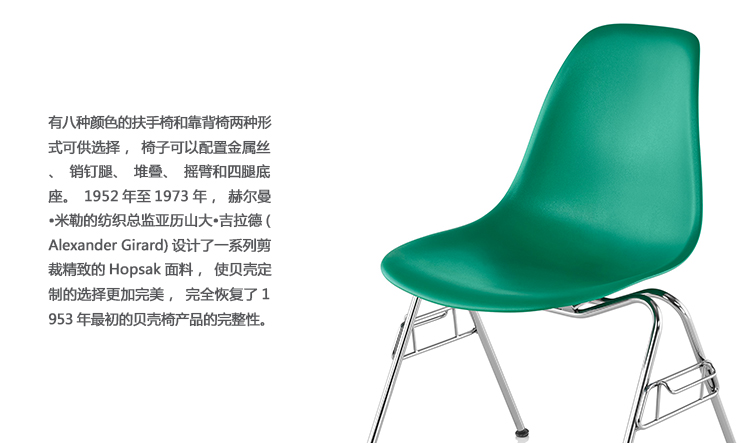 本单品为Eames Plastic Chair 系列成员之一,舒适的椅座外观设计是以添加了玻璃纤维强化的塑料来制作,再搭配上各式不同的脚座来增添使用的多样化,值得一提的是Eames Plastic Chair 的创新技术与材质,便它得以成为全世界第一张被大量制造的单椅。拜现今创新的科技所赐,全系列的Eames Plastic chair 终于再次制造,使用环保可回收的聚丙烯材质,求制作线条优美的椅座外壳,不但重量更轻,同时更具有更好的耐热性及抗化学性。