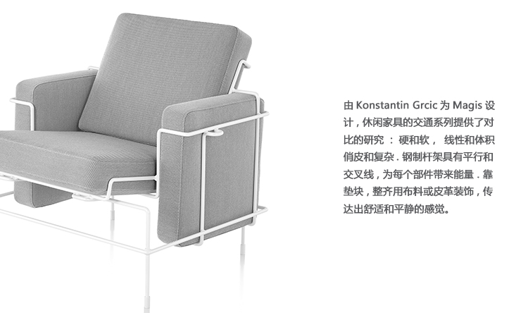 由Konstantin Grcic为Magis设计,休闲家具的交通系列提供了对比的研究:硬和软,线性和体积,俏皮和复杂。 钢制杆架具有平行和交叉线,为每个部件带来能量。 靠垫块,整齐地用布料或皮革装饰,传达出舒适和平静的感觉。