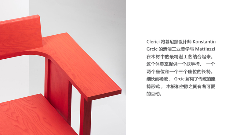 Clerici将慕尼黑设计师Konstantin Grcic的清洁工业美学与Mattiazzi在木材中的最精湛工艺结合起来。这个休息室提供一个扶手椅、一个两个座位和一个三个座位的长椅。细长而稀疏,Grcic解构了传统的座椅形式,木板和空隙之间有着可爱的相互作用。高扶手围绕背部延伸,形成必要的框架,而缺乏完整的背部或侧面则为设计增添了低调的轻盈感。座位上有一个小小的坡度,让您在休息片刻时滑倒。理想的欢迎和过渡地区,Clerici发表了引人注目的声明。