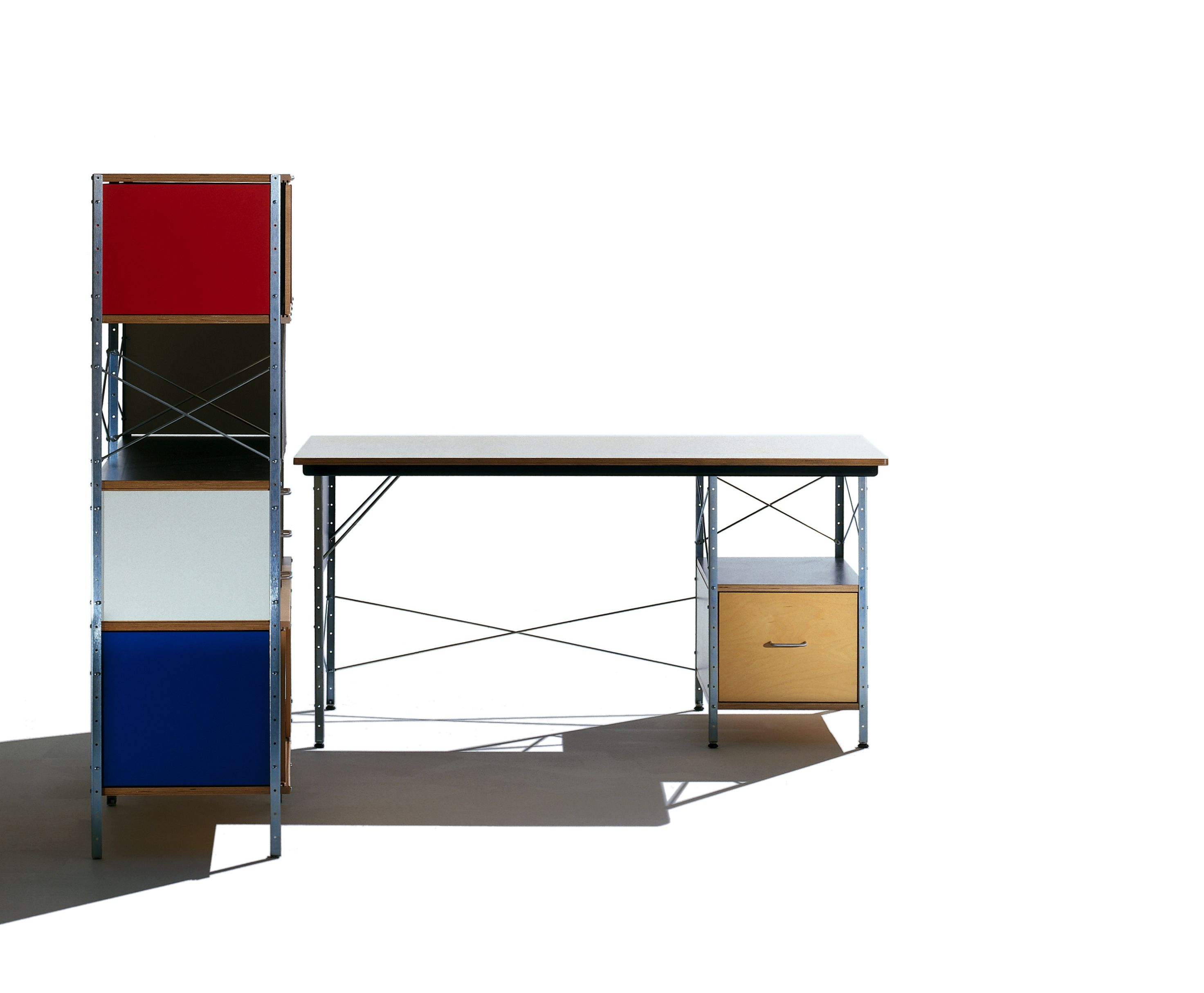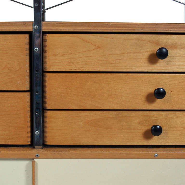 Eames存储单元由五种配置和四种大小的箱子、橱柜和抽屉组成。立柱、交叉支撑板和穿孔板要么是镀锌的,要么是黑色的;橱柜的正面是凹凸不平的胶合板;抽屉的正面和架子是模制的胶合板;箱体侧面和背面的面板是涂硬木的。可供您选择两种配色方案:中性色或亮色。