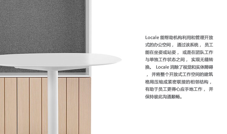 Locale能帮助机构利用和管理开放式的办公空间,通过该系统,员工能在坐姿或站姿,或是在团队工作与单独工作状态之间,实现无缝转换。Locale消除了视觉和实体障碍,并将整个开放式工作空间的建筑格局压缩成紧密联接的相邻结构,有助于员工更得心应手地工作,并保持彼此沟通顺畅。