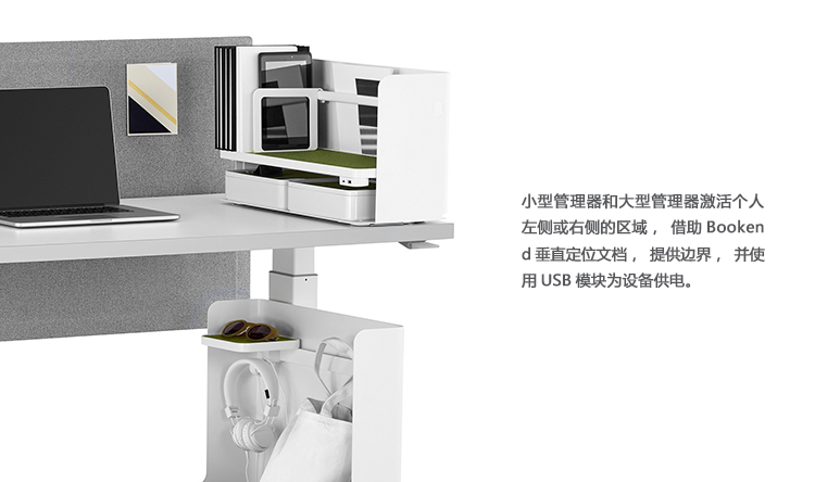 小型管理器和大型管理器激活个人左侧或右侧的区域,借助Bookend垂直定位文档,提供边界,并使用USB模块为设备供电。