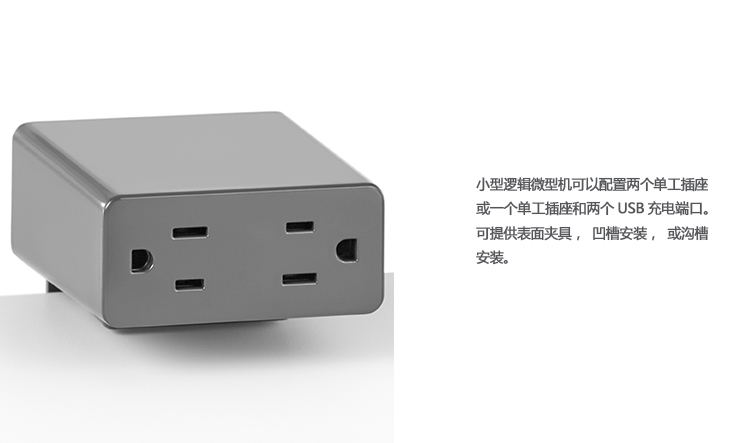 紧凑型Logic Mini可配置两个单工插座或一个单工插座和两个USB充电端口。 可提供表面夹具,垫圈安装或沟槽安装。