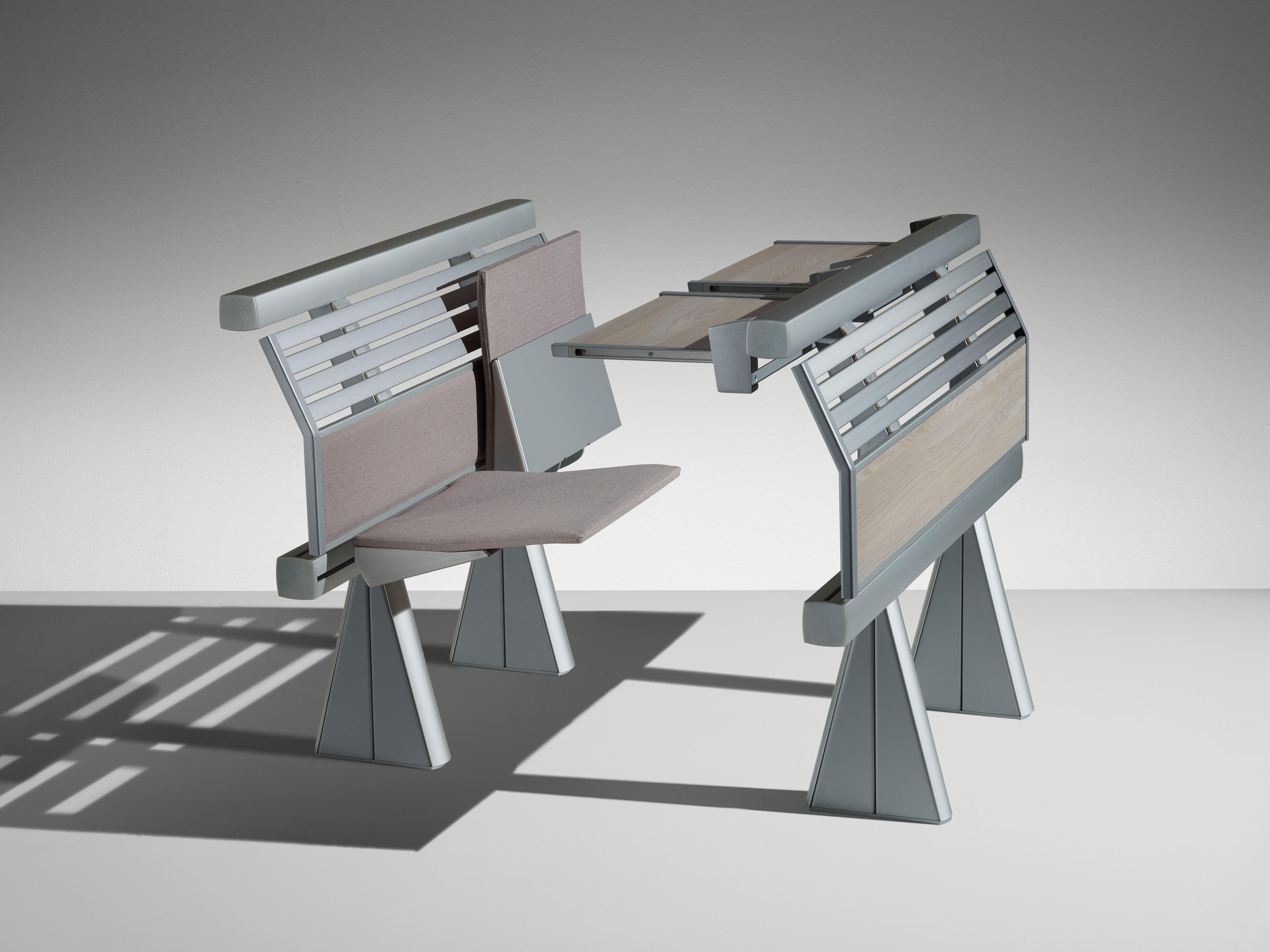 创新的座椅和桌子集成系统,采用新概念结构布局设计,简化装配操作,允许多种组合可能性。‎超越模块化,在克服与模块化相关的限制方面超越模块化,它允许无缝隙的连续形状,以流体水平线为特征,适合于均匀和舒适的学习或工作环境。‎最大自由的组合挤压阳极铝承重结构,有起拱作用和安装辅助元件(立柱、座椅、书写平板、支撑)的通道,无需钻孔或任何预定义的模块化,以保证结构的最大构图自由,甚至在安装过程中。‎安装可以是一条直线,曲线,在台阶上,也可以是在倾斜地板上(座椅之间的中心到中心距离可以调整)。‎靠背和座椅连续靠背版本由板条和挤压的、阳极化的铝型材制成,上部和下部采用双叠层或贴面的中密度纤维板。‎单靠背版采用山毛榉胶合板。‎两种版本都可以用织物或生态皮革填充和覆盖。‎Tip-向上座椅自动靠背,并与靠背进行协调。‎人机工程学设计的后座是按照脊柱的解剖结构设计的,无论使用何种安装配置,都能提供适当程度的舒适性:在水平地板上,在大台阶上,在直线或弯曲的行上。