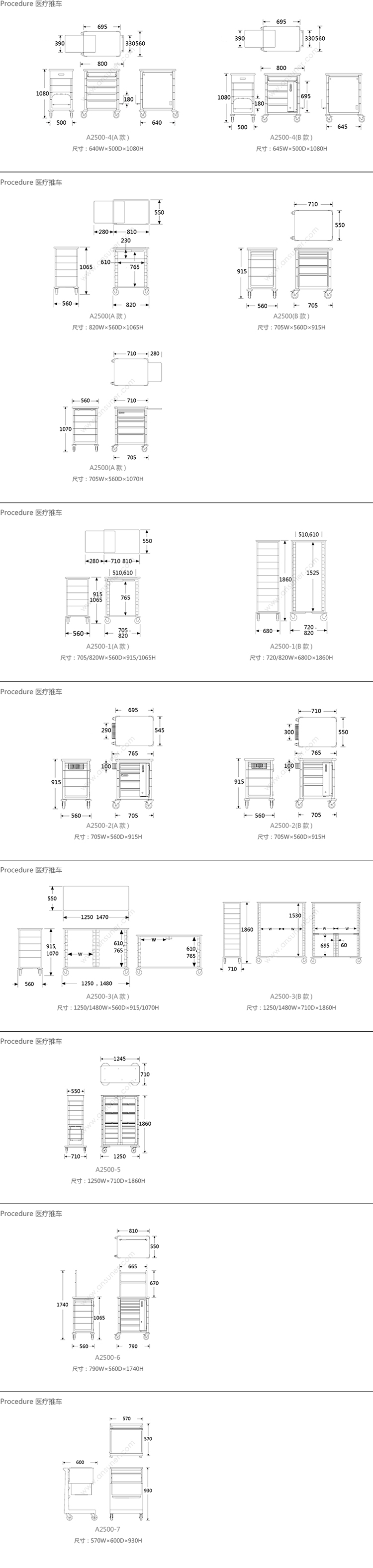 Procedure 医疗推车 系列尺寸/示意图