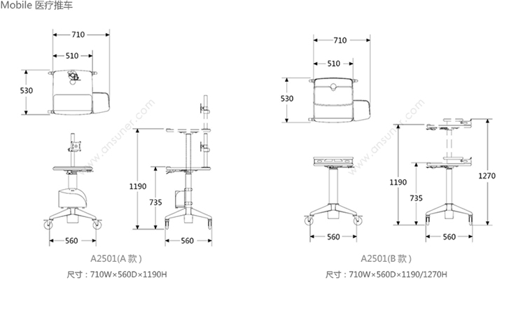 Mobile 医疗推车 系列尺寸/示意图