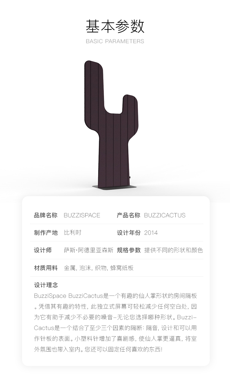 BuzziSpace BuzziCactus是一个有趣的仙人掌形状的房间隔板。凭借其有趣的特性,此独立式屏幕可轻松减少任何空白处,因为它有助于减少不必要的噪音-无论您选择哪种形状。BuzziCactus是一个结合了至少三个因素的隔断:隔音,设计和可以用作针板的表面。小塑料针增加了喜剧感,使仙人掌更逼真,将室外氛围也带入室内。您还可以固定任何喜欢的东西!