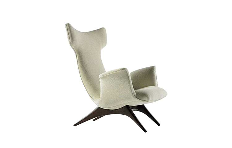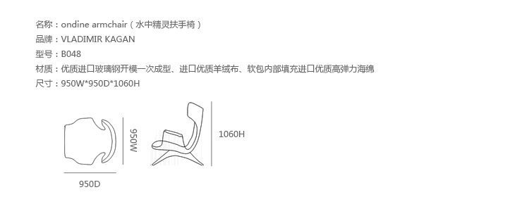 Ondine Armchair(水中精灵扶手椅),设计师Vladimir Kagan的经典作品。制作采用优质进口玻璃钢开模一次成型、结合实木脚架,进口优质羊绒布、软包内部填充进口优质高弹力海绵,提供舒适的人体工学。设计尊贵典雅,造型时尚大气,其流畅且精致的外观造型,只需要一个很小的区域便能散发出简约低调的质朴美感。