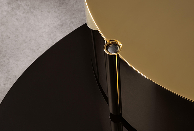 重叠的造型搭配珍贵的材质,这就是Benson的独特之处。木材的质感和金属的光亮感完美展现出雕塑般的造型。Benson边几可以直接放置在地面上,有两种不同的尺寸可供选择,以满足不同的功能需求。尺寸为120x95厘米的版本,基座为椭圆形,上方面板为圆形,配备的机械装置可以使其旋转360度,增强边几的延展性,使其更加靠近沙发座椅。直径为46厘米,高度为38厘米的版本,专门用于放置在沙发和扶手椅的侧方,有以下组合可供选择:一种是下方台面为亮面乌木,上方台面为亚光铜色板材;另一种是下方台面为Moka色亮光漆,上方台面为金色亮光漆。