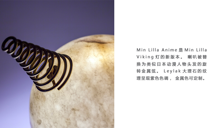 Min Lilla Anime是Min Lilla Viking灯的新版本。 喇叭被替换为类似日本动漫人物头发的旋转金属弦。 Leylak大理石的纹理呈现紫色色调,金属色可定制。