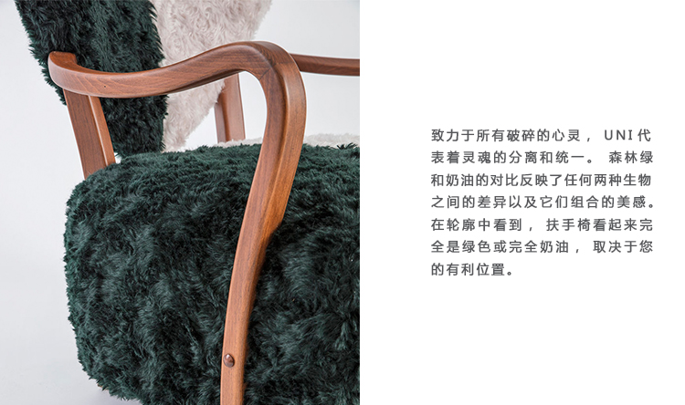 致力于所有破碎的心灵,UNI代表着灵魂的分离和统一。 森林绿和奶油的对比反映了任何两种生物之间的差异以及它们组合的美感。 在轮廓中看到,扶手椅看起来完全是绿色或完全奶油,取决于您的有利位置。