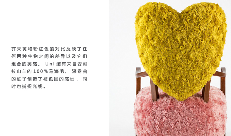 Uni装有来自安哥拉山羊的100%马海毛。 深卷曲的桩子创造了被包围的感觉,同时也捕捉光线。