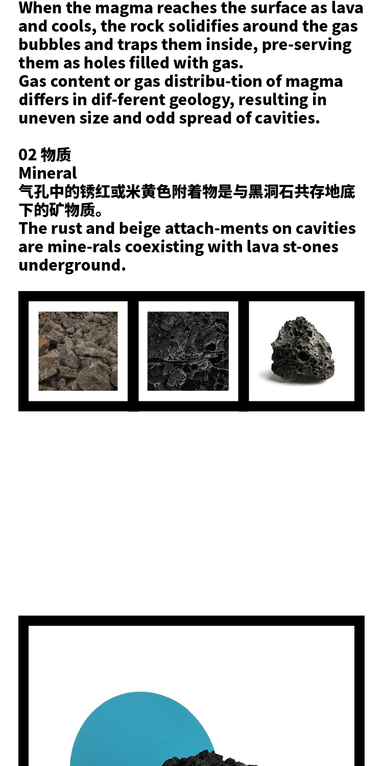 洞黑系列,洞悉秘密,来自地心的喷发。极想把洞石的芳华寂寞倾述出来,呈现于日常并使用它。尝试将洞石塑造各种形态,原材,呈浅灰色;亚光,颜色渐渐加黑;抛光,纯黑了。三种状态,魅力各异。深入践行,洞石的特性愈显,吸音、防水、防火、保温、隔热,耐酸碱、耐腐蚀、耐沾污、耐霉变,且无污染,无放射性。惊喜不断,质量很轻的洞石,居然强度很高,轻、硬,可塑性强,气孔式的通透,赋予了极简中的奢华。触目的拙,爱不释手。