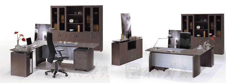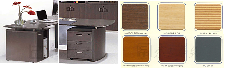 ※  独特而时尚,木制行政人员书桌主要由一张两侧微弧形的桌面以两旁湾间隔板组成,前面四分之三高度的面板配以哑面银色,而附加的桌面由掩门式或开放式的小文件柜以放置电脑主机。多元化的储物配置包括活动文件柜、掩门地柜或地柜由中抽屉、上层架及两边掩门构成,另有归一设计的组合柜包括下部掩门、玻璃门及上部开放层架,同款弧形设计的会议桌可选择附加线缆储存系统。