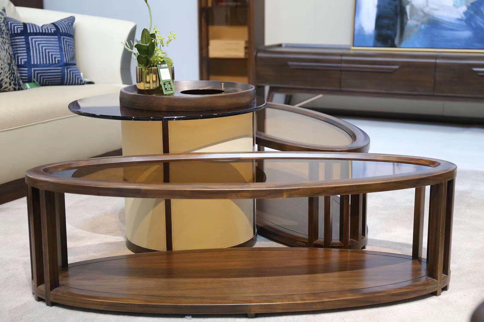 1.黑胡桃木边框与茶色玻璃的组合,勾勒出休闲几的精巧简练。 2.通过转动茶几面铜制拉手,可打开不同区域物品,功能分区强。 3.休闲几小巧干练,可根据需要随意进行家居布置。