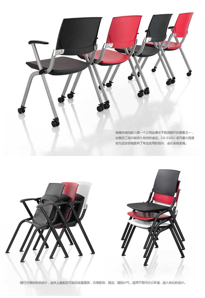 CG-E1052系列有多种配置,适用于职员、接待、会客、培训和会议,颜色选择丰富,椅身曲线设计紧贴人体背部,造型时尚、优美、简洁。