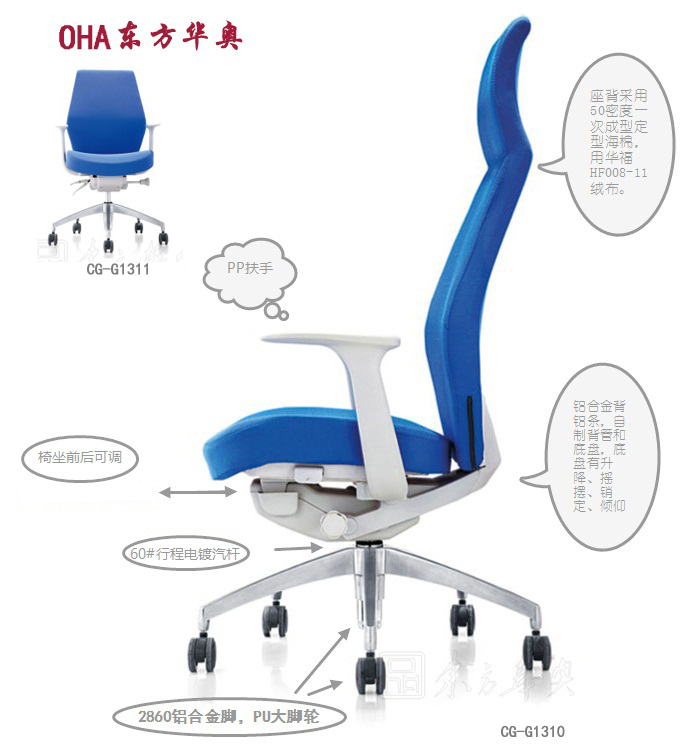调节功能。座背采用50密度一次成型定型海棉,用华福HF008-11绒布。