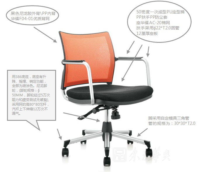 A:黑色尼龙胶外背,50密度一次成型PU定型棉,PP扶手PP防尘套和PP内背,用华福