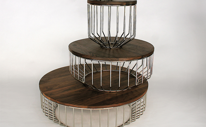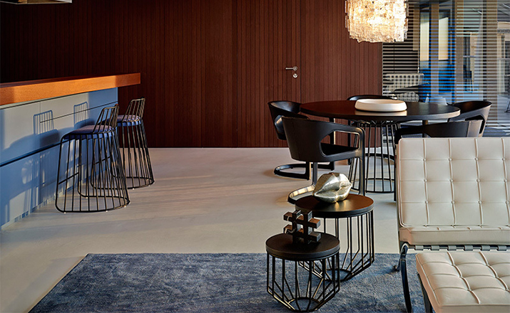 Blending sloping angles and taut lengths of bent metal are a modern interpretation of the wiry idea initially conceived by Warren Platner.The series is made up of a suite of wire tables,side tables and benches and fitted with luxurious solid wood tops.