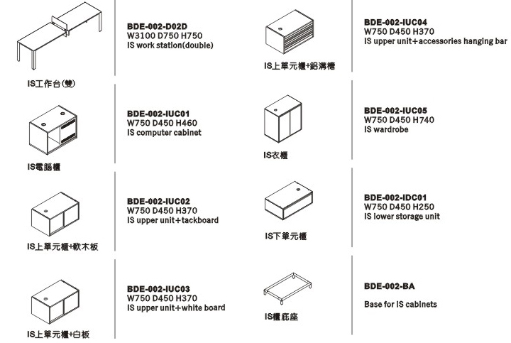 单元柜有标准的下文件柜、上文件柜、、电脑柜、衣柜可供配置,上文件柜又有软木背板、白板背板、铝沟槽背板可供选择。