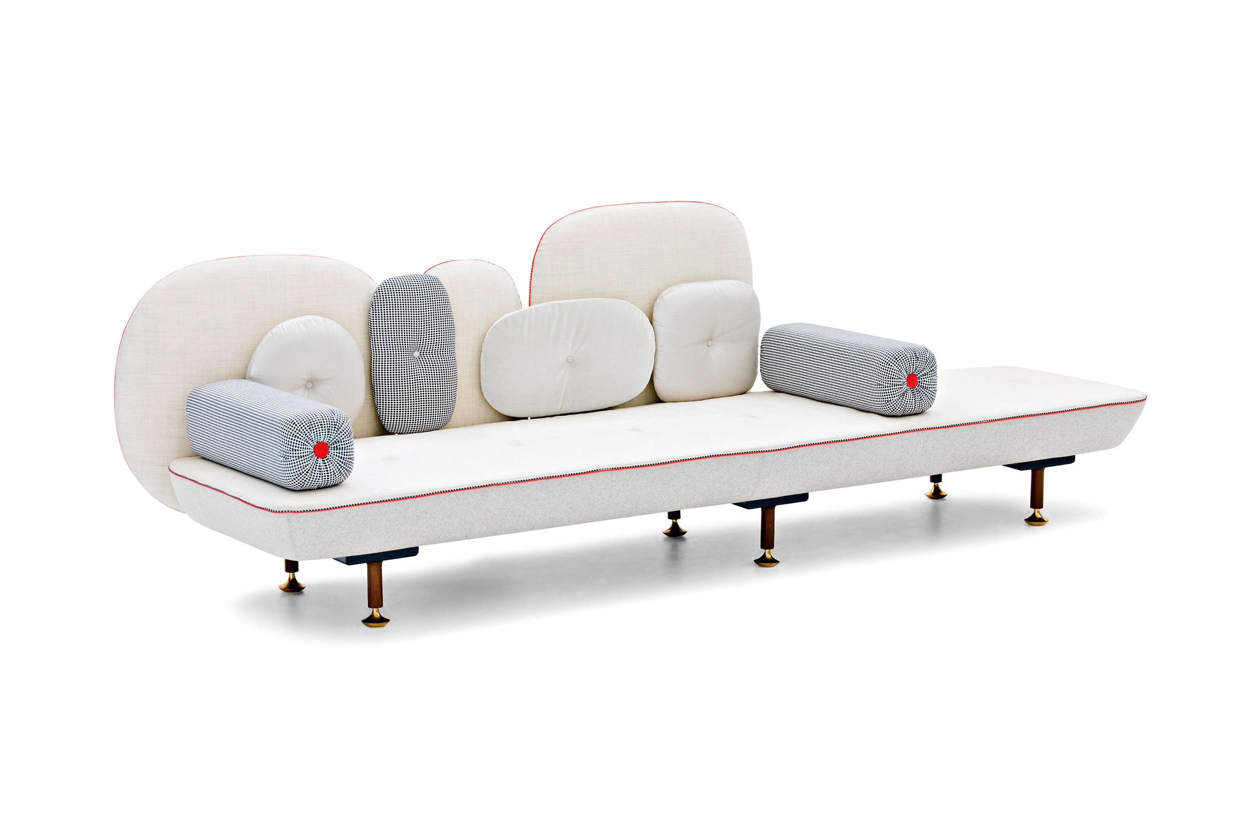 我美丽的背面是一个座椅的集合,它的靠背是由各种形状的高颜色的浮动靠垫组成。座椅越宽,可以使用的垫子就越多。我们使用超大的符号,比如靠垫上的按钮,是一种传递各种信息的方式。这些符号也提供了一种定制椅子的方法,让它变得独一无二,就像你对一件衣服的区别一样。上面的床垫上覆盖着不同的物品,因为他们从一个现代的公主身上得到灵感,他们用金和银镶边。
