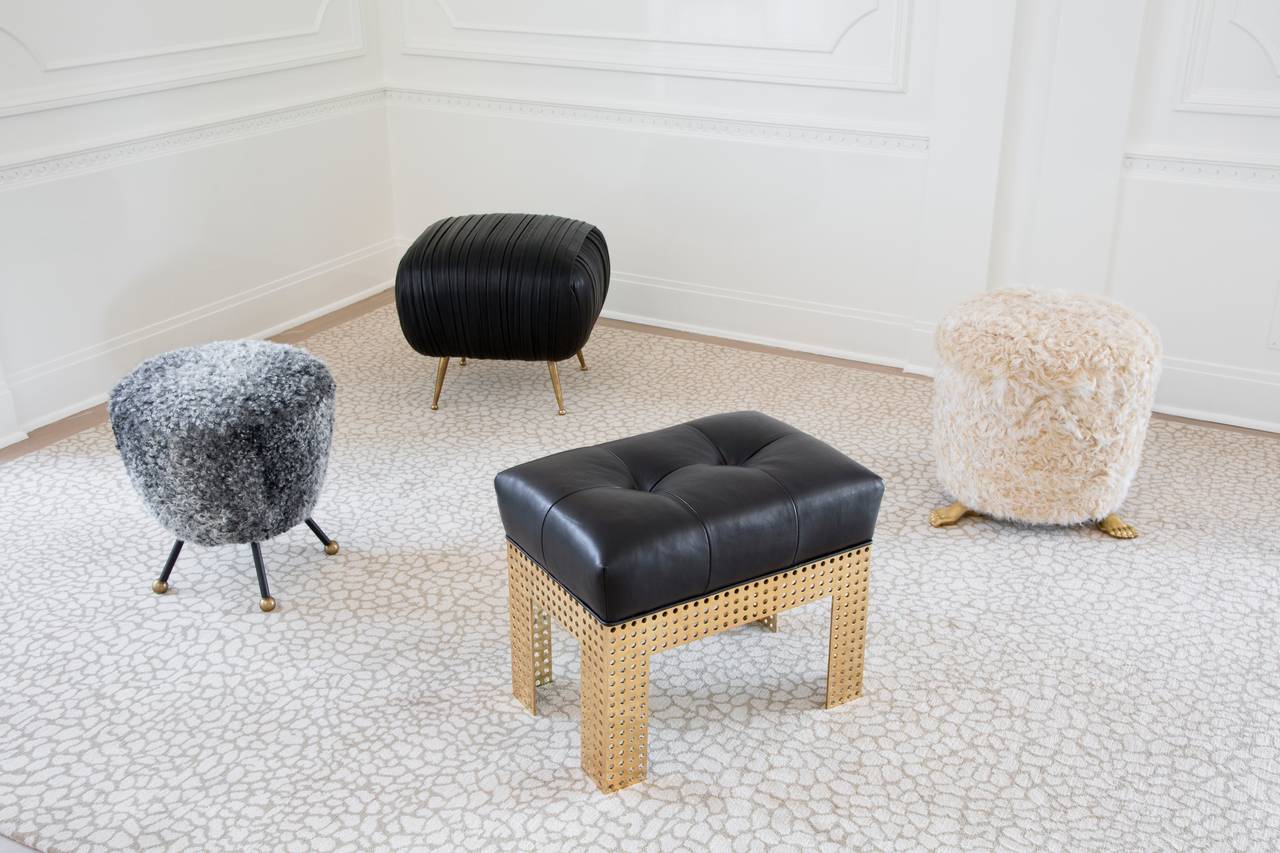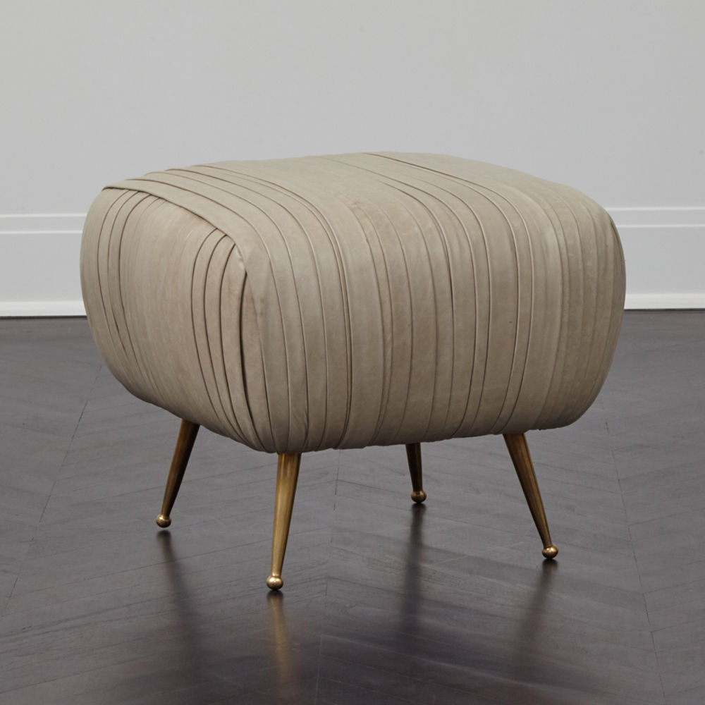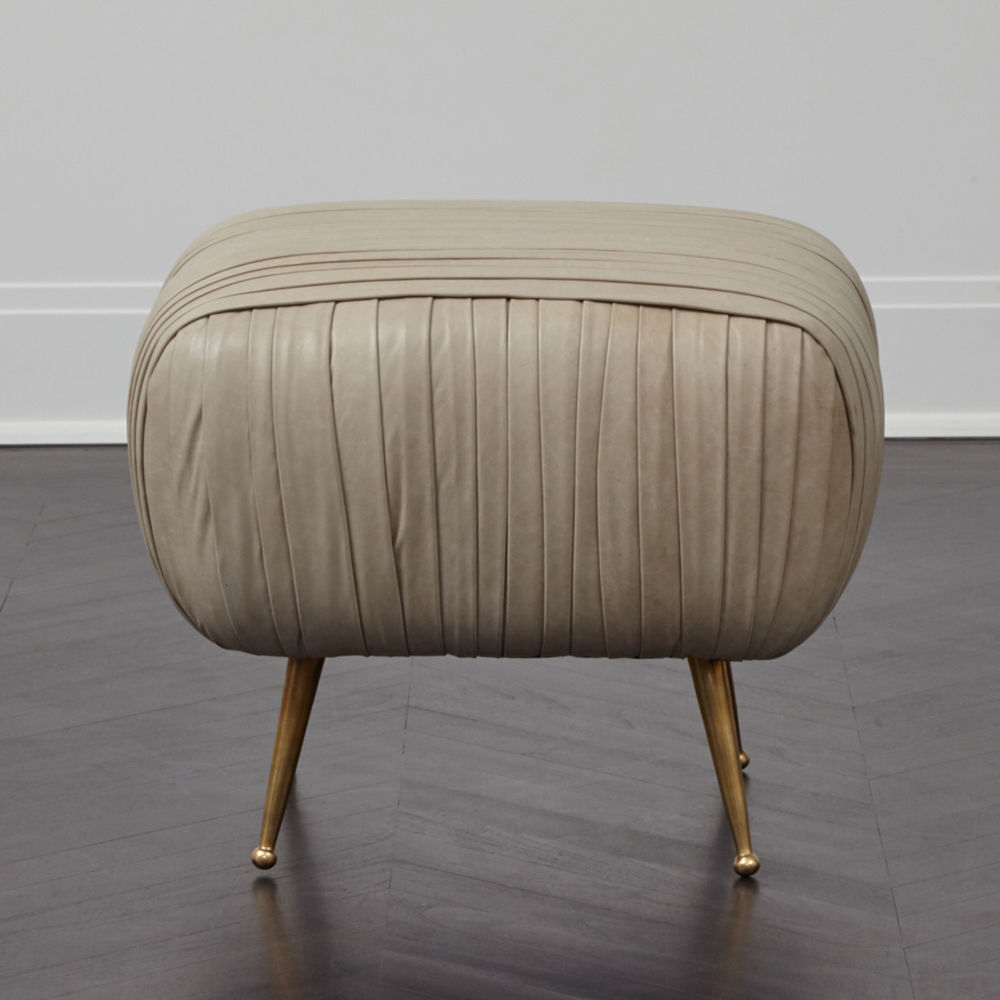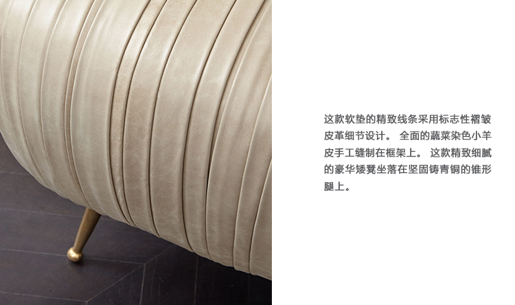 这款软垫的精致线条采用标志性褶皱皮革细节设计。 全面的蔬菜染色小羊皮手工缝制在框架上。 这款精致细腻的豪华矮凳坐落在坚固铸青铜的锥形腿上。 这是一个优雅的作品,小巧的比例,与舒芙蕾椅的完美搭配,或作为自己的声明。