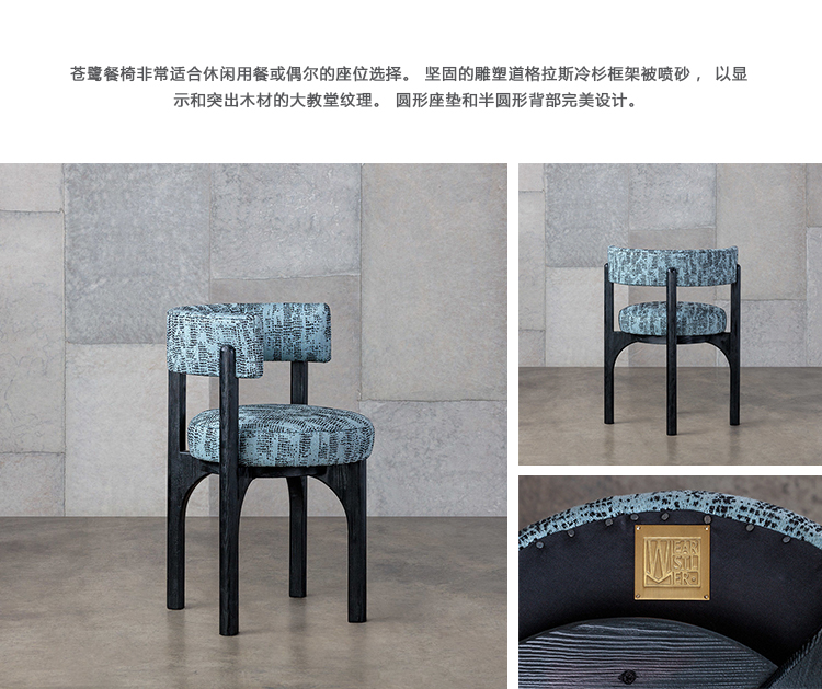 苍鹭餐椅非常适合休闲用餐或偶尔的座位选择。 坚固的雕塑道格拉斯冷杉框架被喷砂,以显示和突出木材的大教堂纹理。 圆形座垫和半圆形背部完美设计。 这款椅子目前仅限于我们经典的黑檀木饰面。