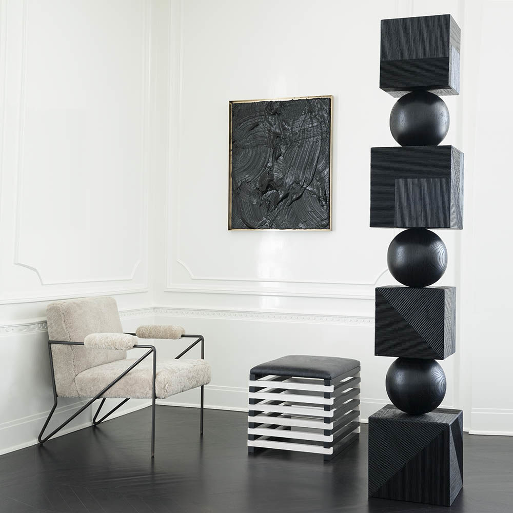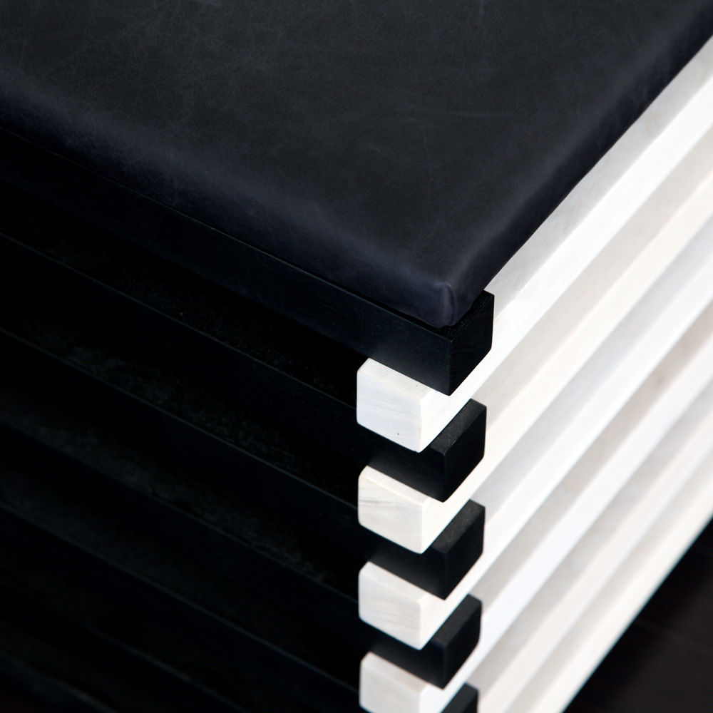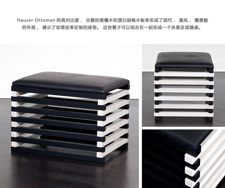 Hauser Ottoman的高对比度,交替的黑檀木和漂白胡桃木板条形成了现代,通风,雕塑般的外观,展示了纹理皮革定制的座垫。 这些凳子可以组合在一起形成一个休息区或矮桌。