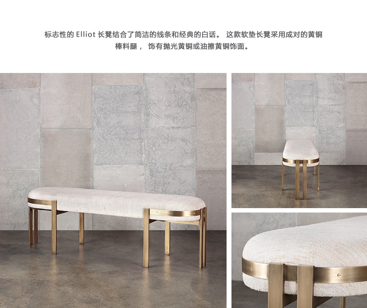 标志性的Elliot长凳结合了简洁的线条和经典的白话。 这款软垫长凳采用成对的黄铜棒料腿,饰有抛光黄铜或油擦黄铜饰面。 座椅有各种精选面料和皮革可供选择。