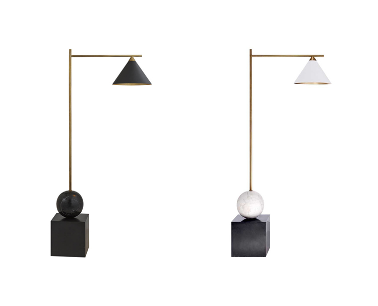 Cleo落地灯以大胆的几何形式突出了混合材料的美感。 这款落地灯采用古董抛光黄铜和青铜细节,镀金色罩内饰,可选择白色大理石底座的古董白色灯罩或黑色大理石底座黑色灯罩。