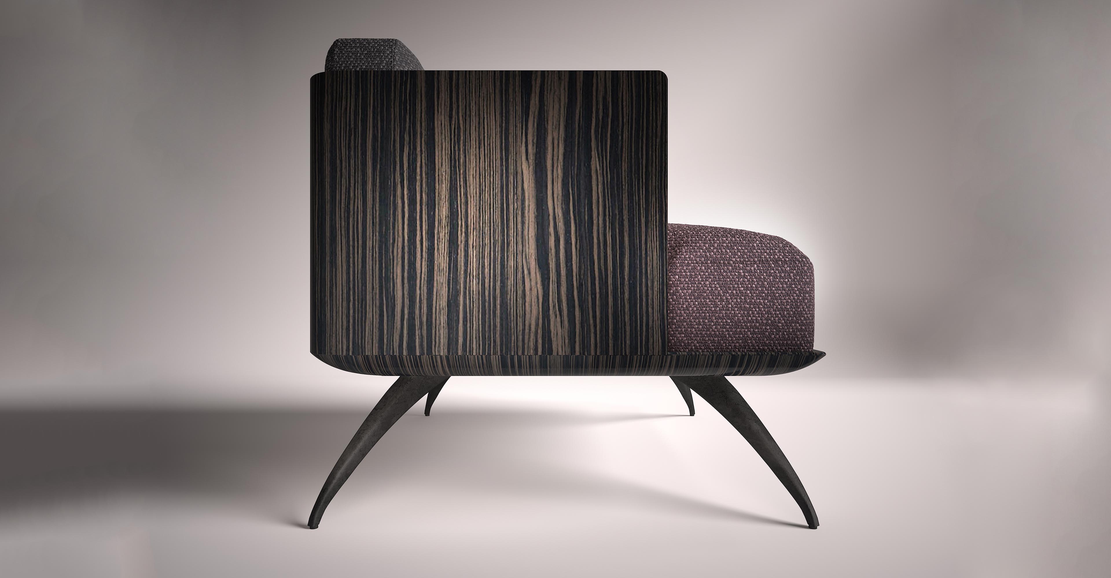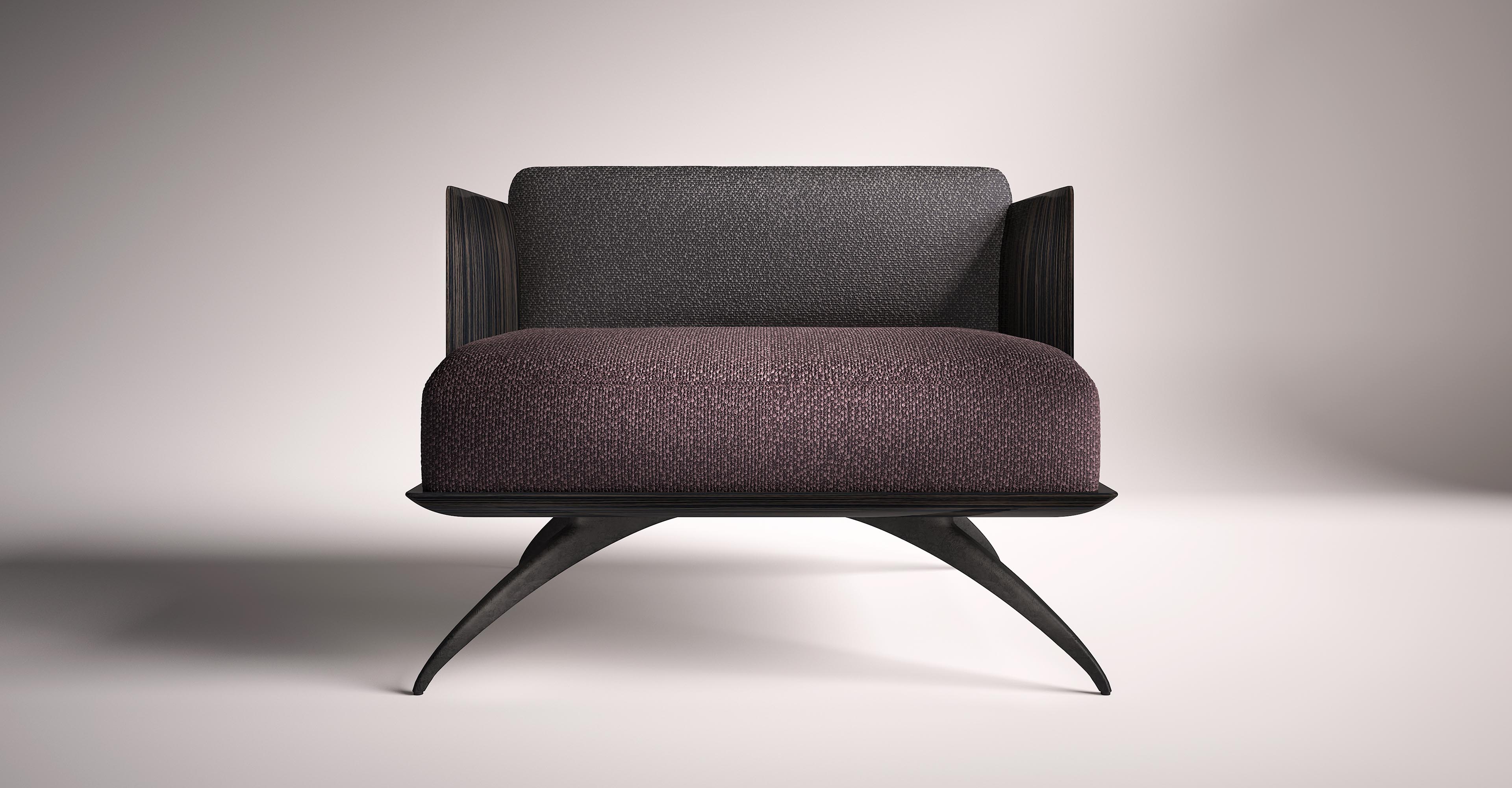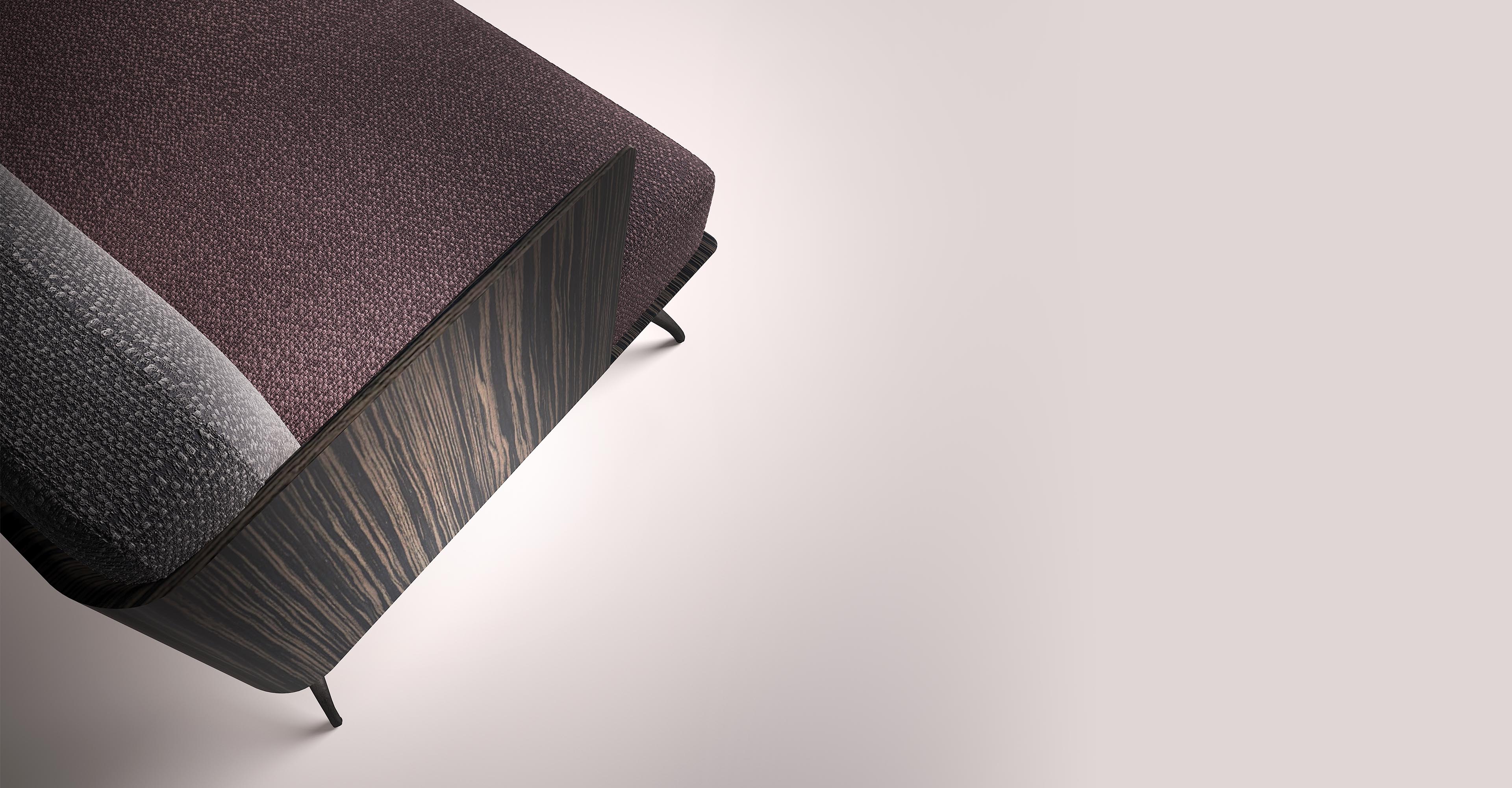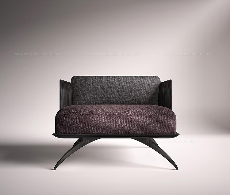 与深灰色靠背相对的勃艮第面料座椅完全符合其框架。锃亮的钢腿和这把漂亮的扶手椅非常相配。