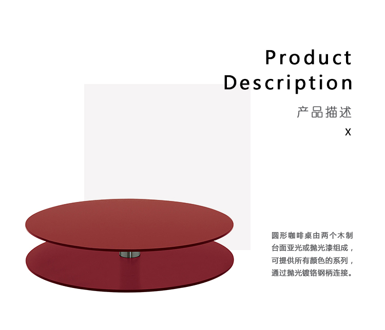 圆形咖啡桌由两个木制台面亚光或抛光漆组成,可提供所有颜色的系列,通过抛光镀铬钢柄连接。