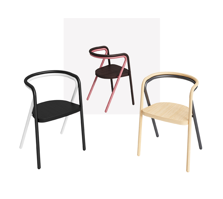 就像拥抱Chair 2的结构一样,它重新审视了经典线性的形式,将珍贵的木材与涂有铁的管子组合成不透明的环氧树脂粉末。 因此,桦木胶合板中的座椅由双管状结构支撑,该双管结构在后部动态地剪接在腿上:前部由实心灰木制成,后部由金属制成。