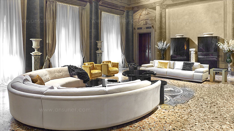 咖啡桌和边桌是一种富有美感的设计。顶部的圆形和圆柱状结构装饰有金属细节,与漆面形成对比。