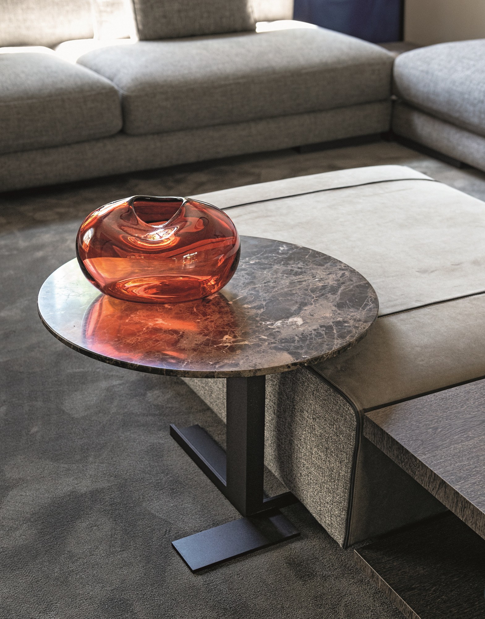 这些小桌子的外形很有吸引力:不同寻常的对比,柔软的和刚硬的组成部分共存,传达出和谐的、国际化的风格。它们可以像小行星一样被放置在房间里。有三种桌面可供选择:圆形、方形和长方形,桌面材质为大理石或砂岩,也有钝边的熏玻璃桌面。金属基材有云母棕,氧化灰或黑镍。
