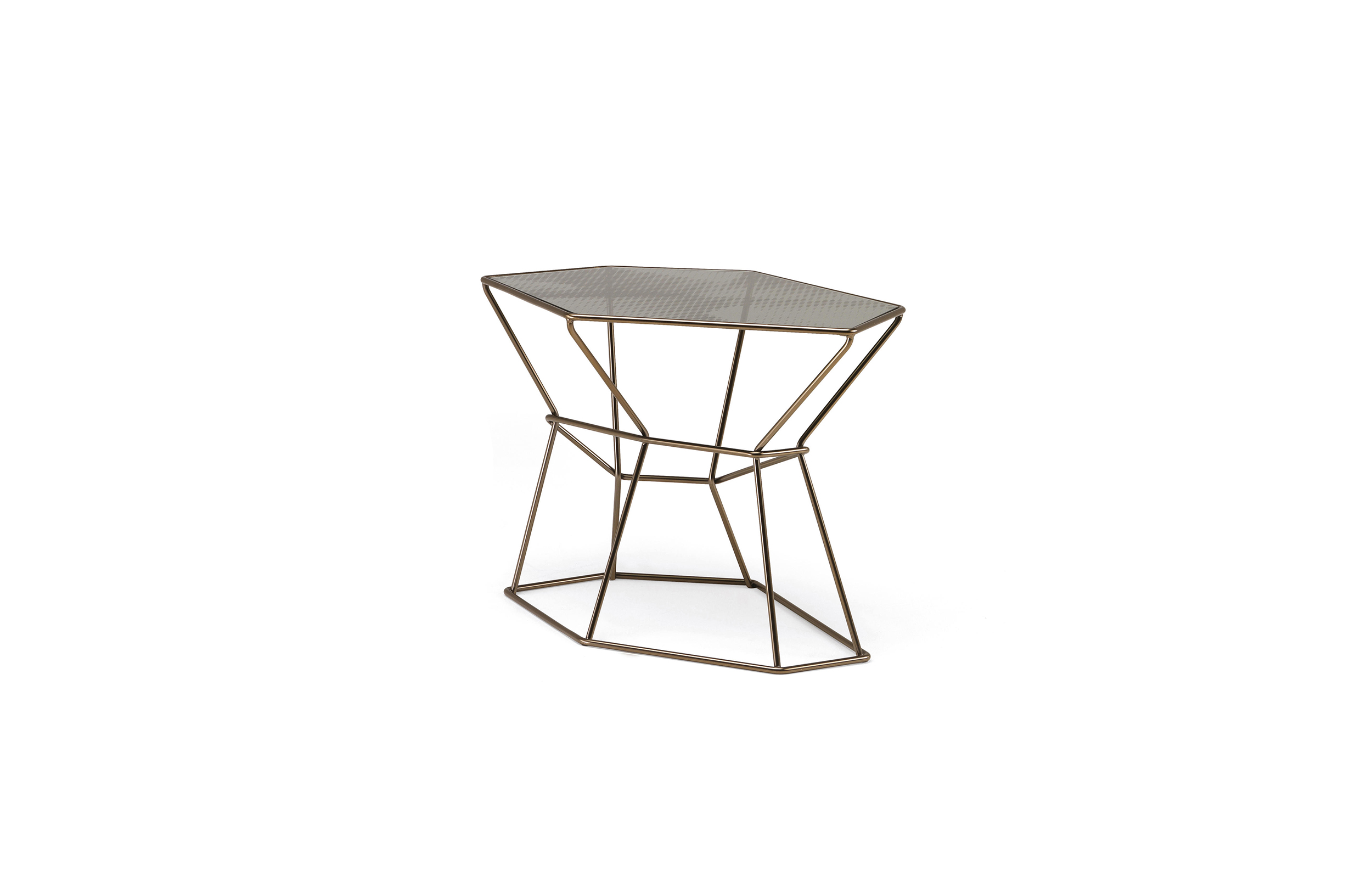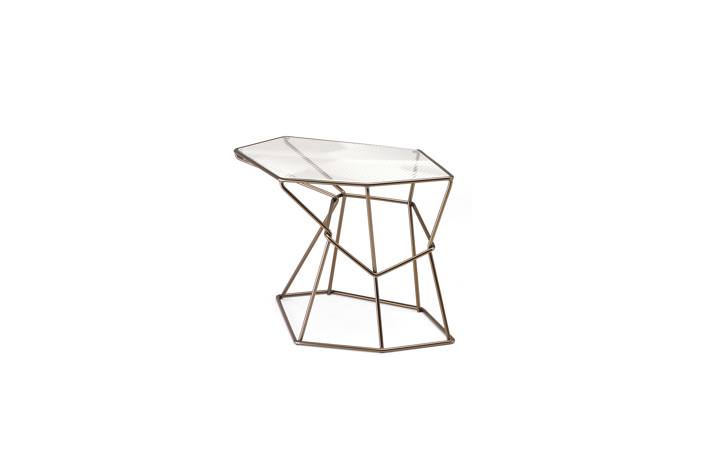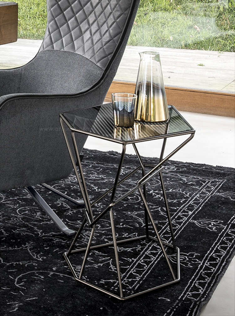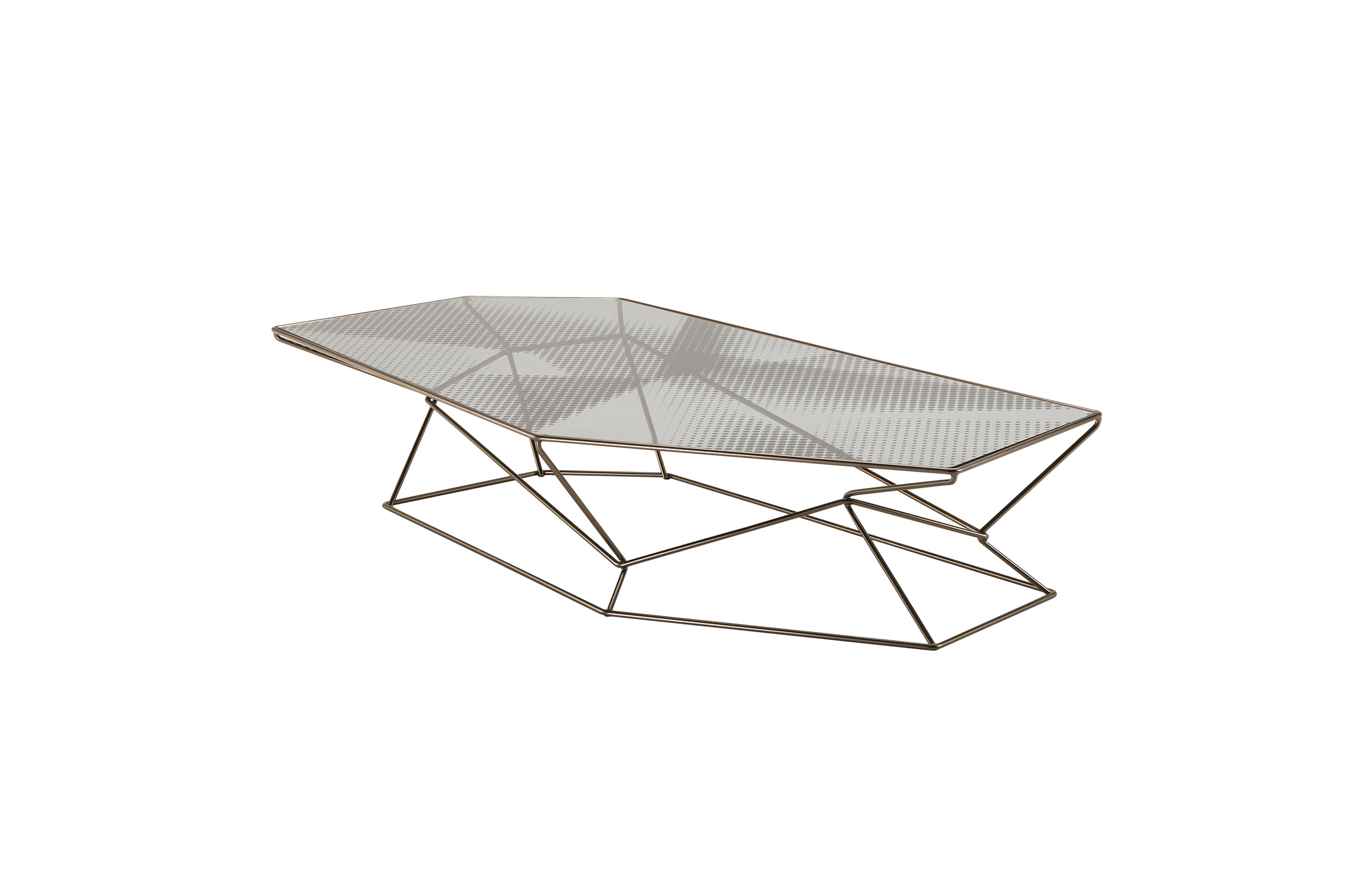 马洛·利帕利尼(Mauro Lipparini)的这款“倒车矮桌”(Rebus low tables)有金属结构,云母棕色的染色或镀锌的钛,以及一层金属丝的玻璃。结构和顶部都有不规则的形状,形成一种不寻常的交织。