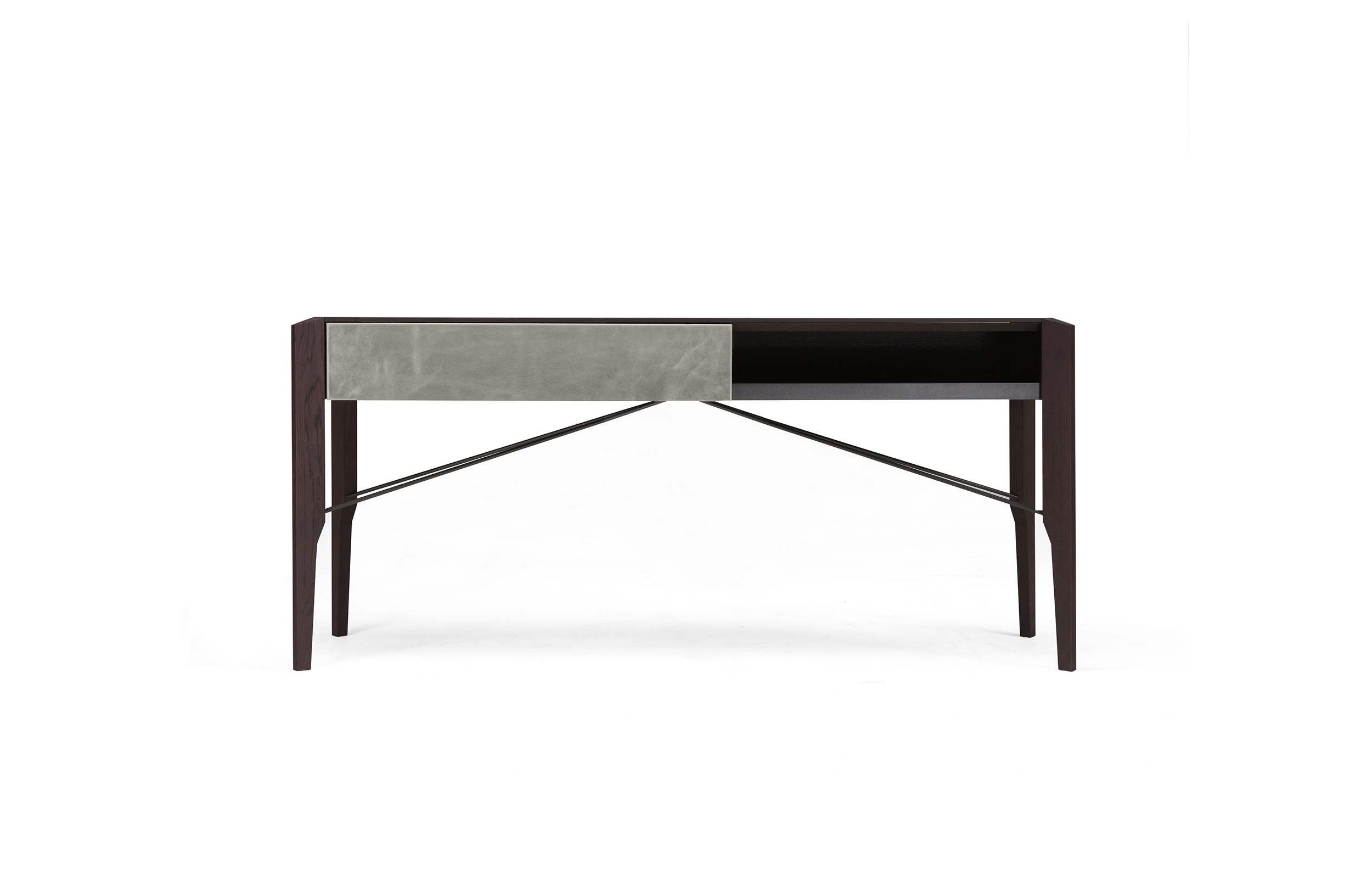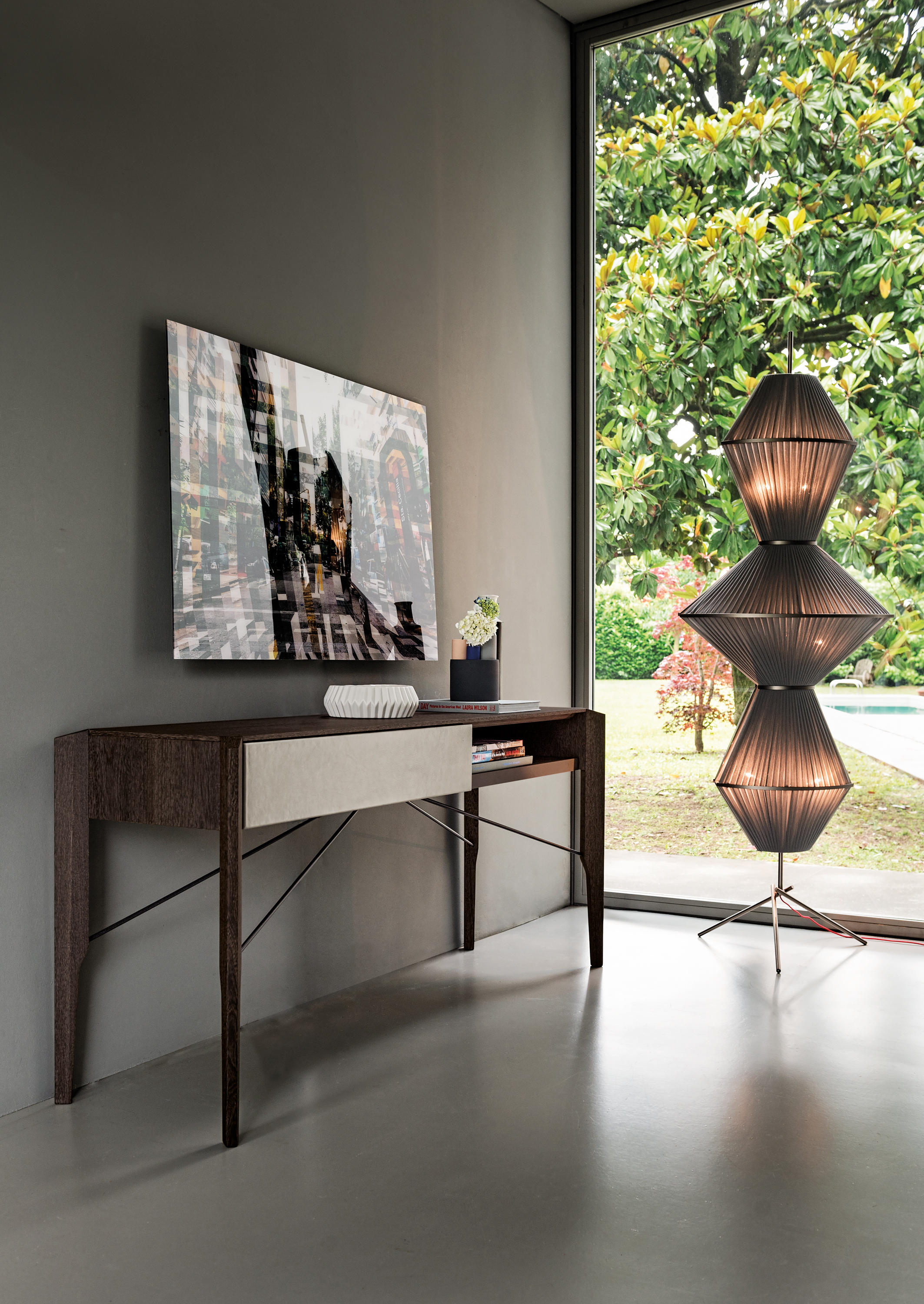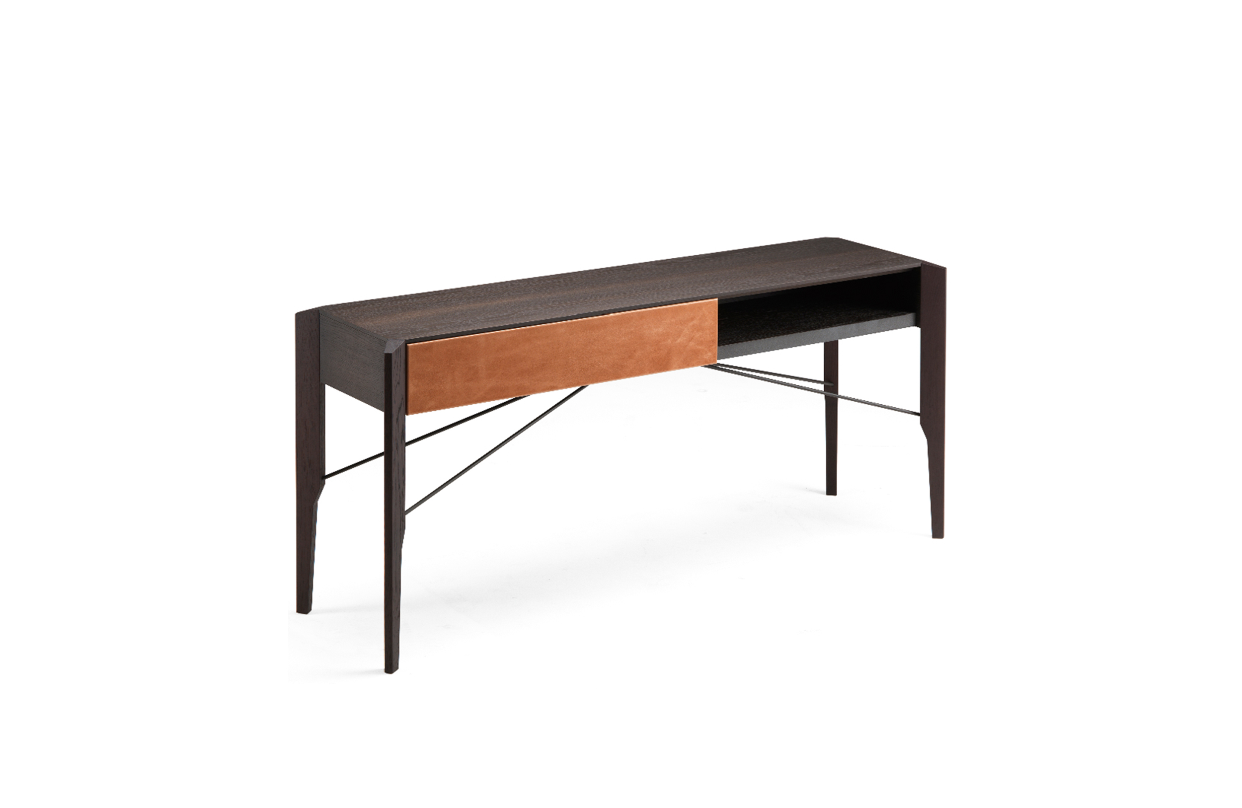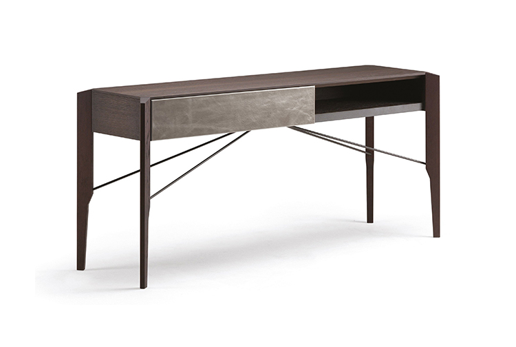 Manzoni & Tapinassi装饰柜的侧板可以在摩卡橡木、卡纳莱托胡桃木或苏皮亚木上选择制作,金属框架由云母褐色或镀锌钛制成。虽然它的结构看起来很薄,却起到了很好的支撑作用。