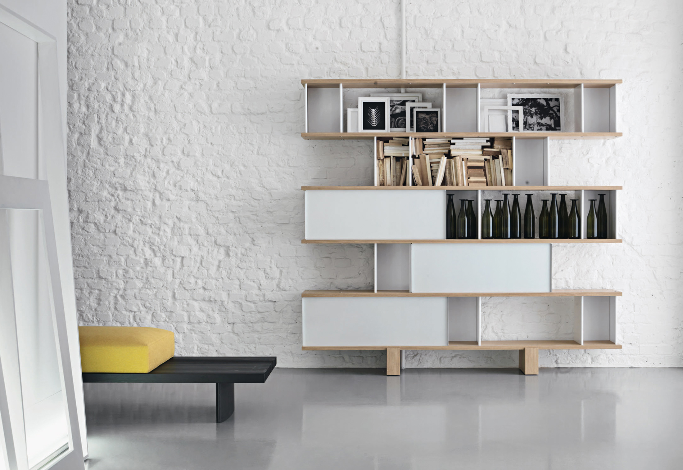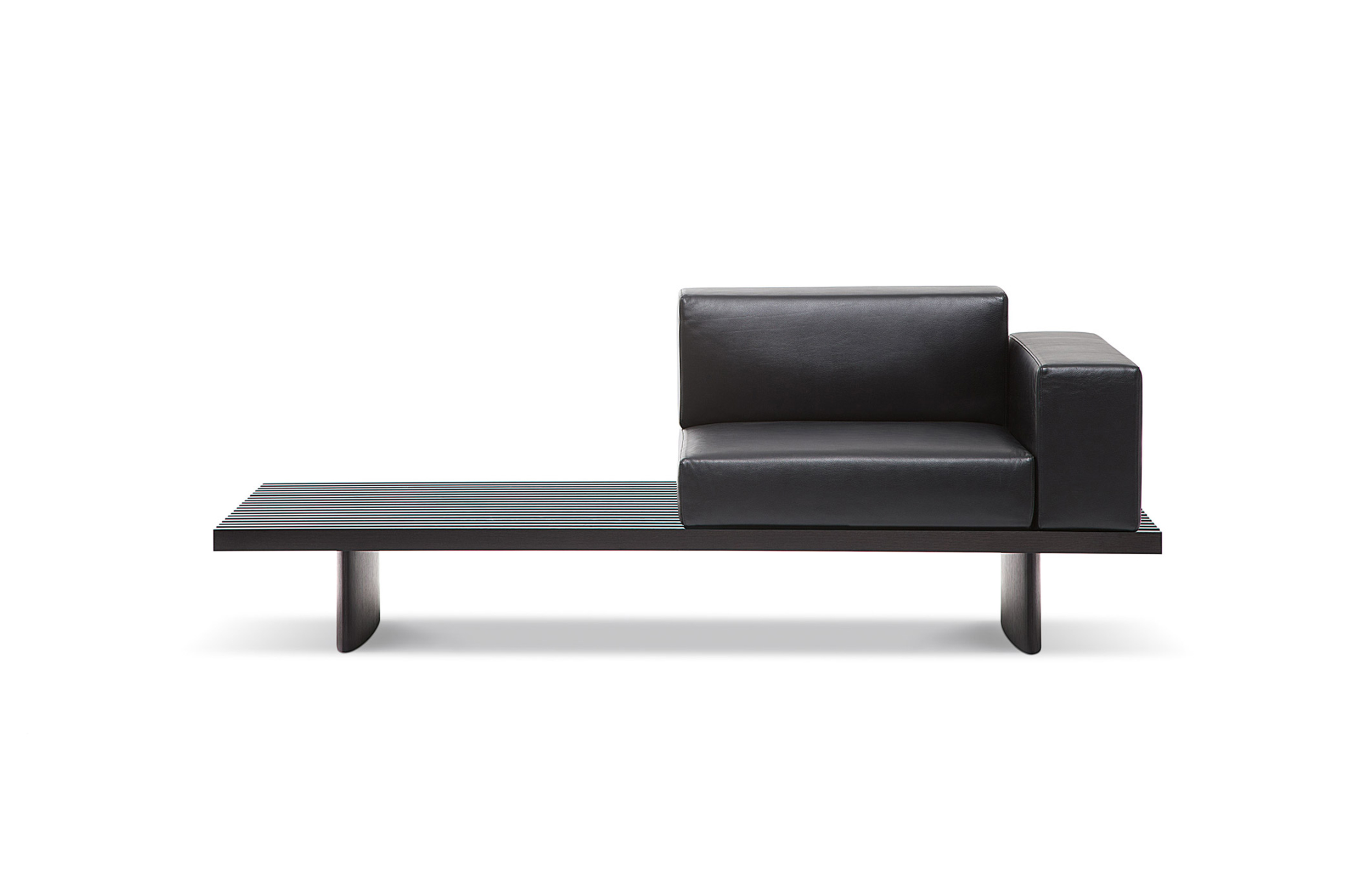 用作矮桌、长凳或和只需配备靠垫就能成为软榻的模块化系列。框架采用天然木色或黑色橡木。表面由19根板条组成;采用两条或三条支腿。软垫采用聚氨酯纤维和喷胶棉填充,用于扶手、座面,配对软垫: 一个座垫和一个靠垫。使用简单的固定装置就可将软垫固定于框架上。软垫可自由定位于表面的任何部分;因此,可使表面按照所需的尺寸用作座椅底座或顶面。
