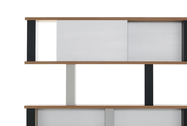 体积和空间的随心改变以及垂直结构的色彩排列变化使这款书柜极具动感。它有高、低两种款式,书架用天然橡木并在垂直方向交替漆以黑白双色。 滑动装置镀有缎铝阳极氧化膜。