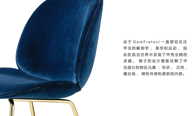 由于GamFratesi一直密切关注甲虫的解剖学,美学和运动,因此在昆虫世界中发现了甲壳虫椅的灵感。 椅子的设计重新诠释了甲虫部分的特征元素:形状,贝壳,缝合线,刚性外部和柔软的内部。