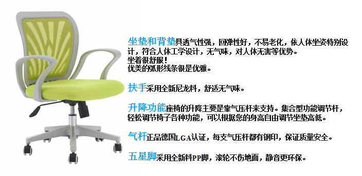 1、椅背:背网采用韩国进口网布,透气性强,背框为尼龙材料注塑成型,腰靠栅栏状设计,靠感舒服兼具透气性能。